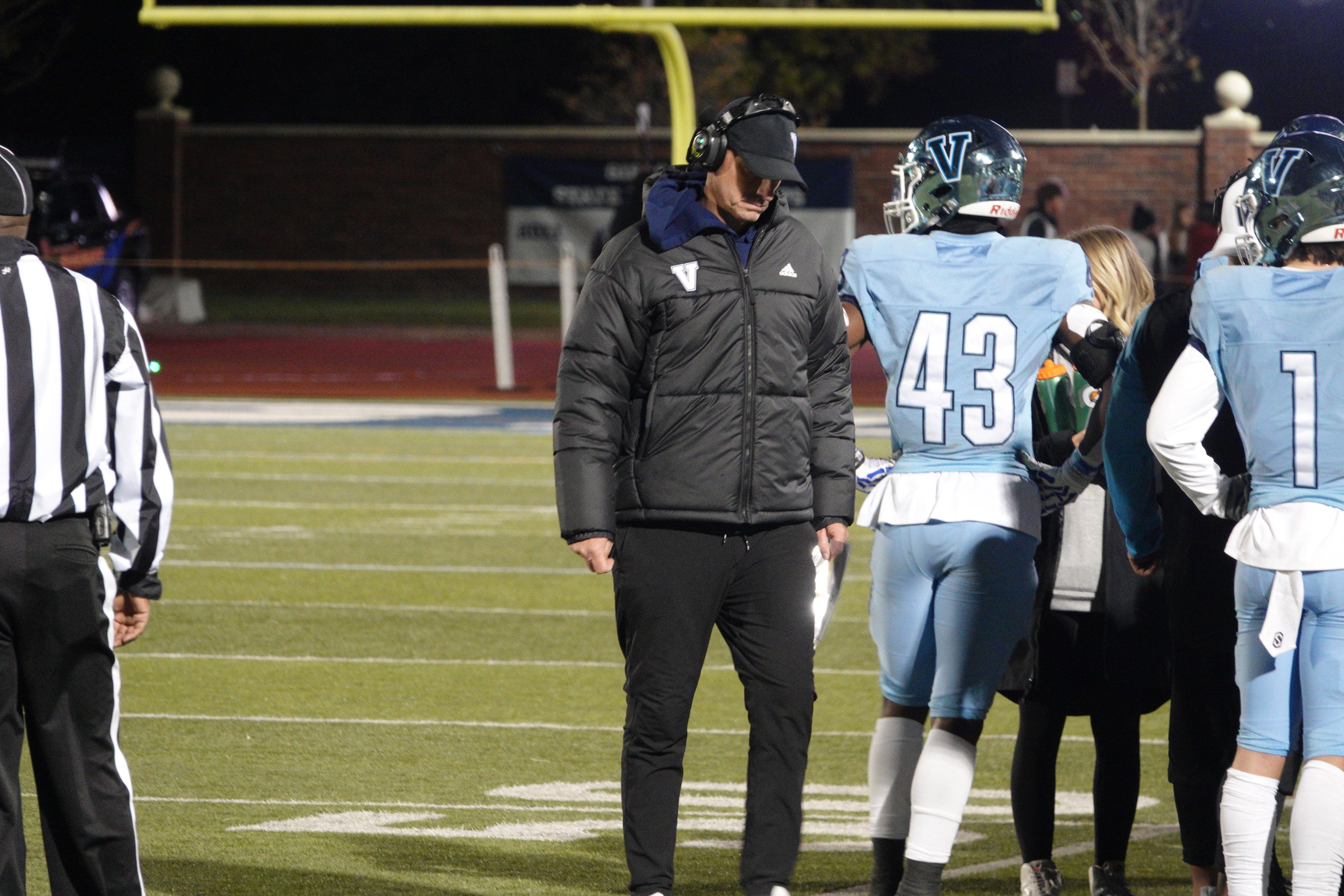 Coach Scott Darnell, #56 Chase Zimmerman, and Head Coach Bret Mcgatlin all stand on sideline during playoff game for Valor Christian vs Legend high school in Highlands Ranch, Colorado 11-10-2023 (Michael Tierney, CU News Corps).