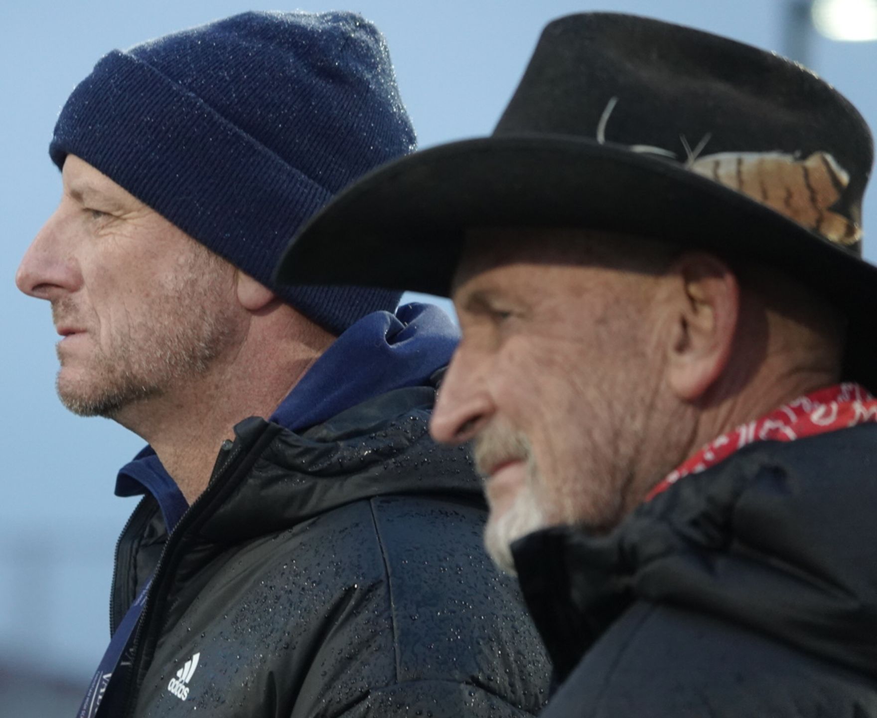 Head Coach Bret McGatlin (left) and his father stand together at a Valor football practice in Highlands Ranch, Colorado 11-8-2023 (Michael Tierney, CU News Corps).