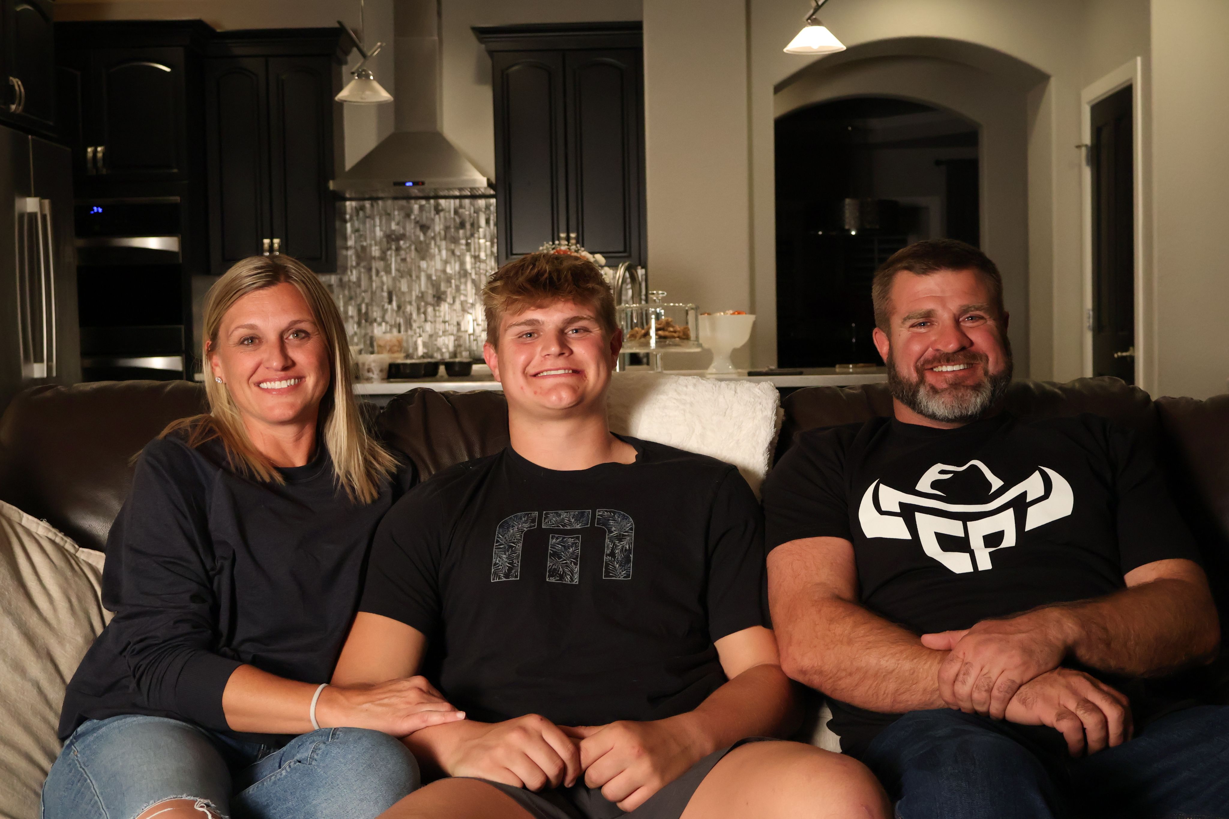 Chase Zimmerman sitting at home with his parents, Scott and Lindsey in Parker, Colorado 11-10-2023 (Michael Tierney, CU News Corps)