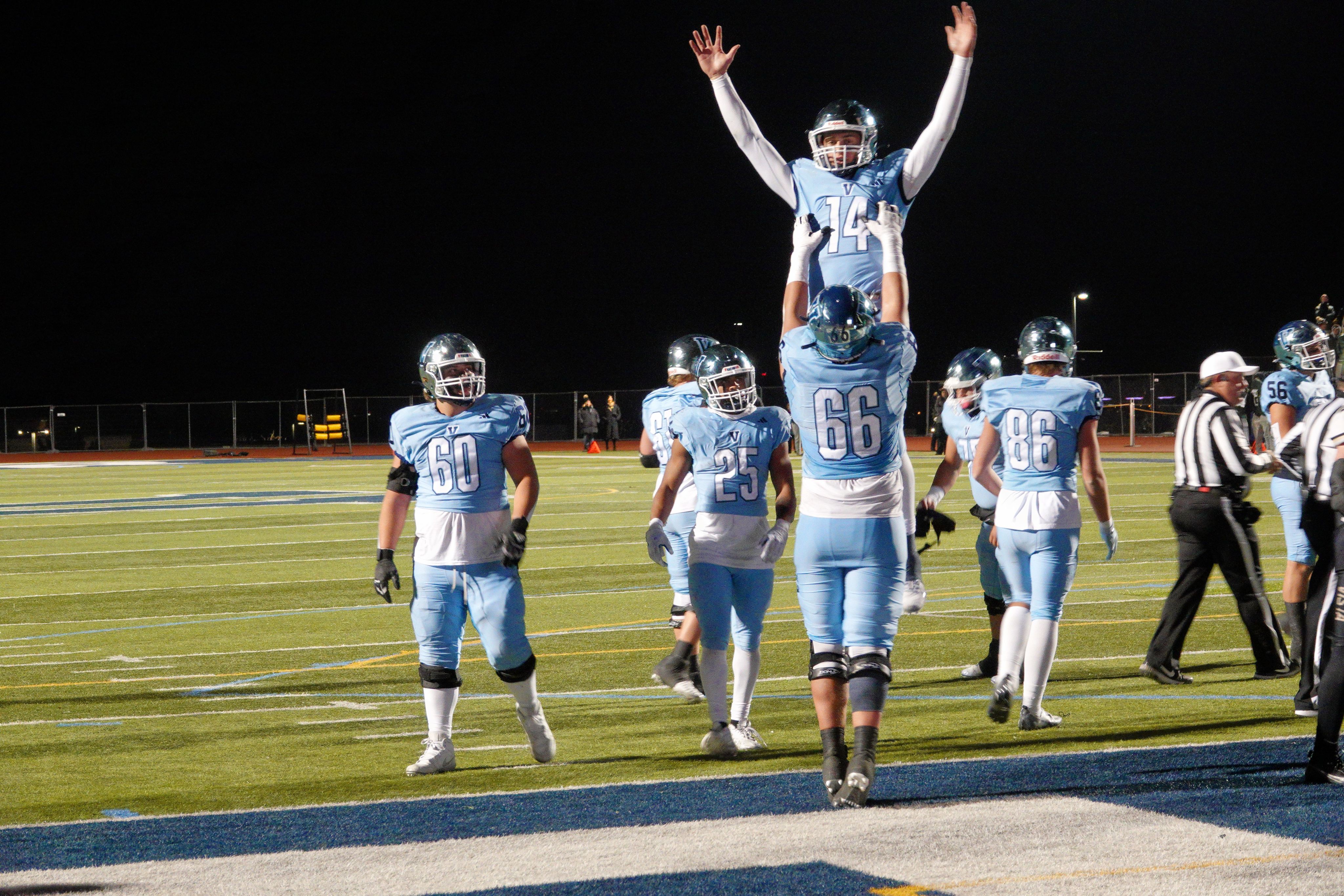 #66 Kannon Smith lifts #14 Asher Weiner into the air after Valor scored a touchdown as teammates look on during the game vs Mountain Vista High School in Highlands Ranch, Colorado 10-27-2023 (Jared Brendlinger, CU News Corps)